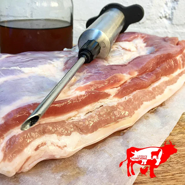 Place 2 cups of the brine in a bowl (this is so you don’t contaminate the rest of the brine with raw meat. Using a meat syringe, suck up the liquid and in a methodical method, inject the meat in 1 inch intervals from the side. Whilst pushing the syringe, pull the needle out at the same speed. Cover and refrigerate for at least 6 hours before using.